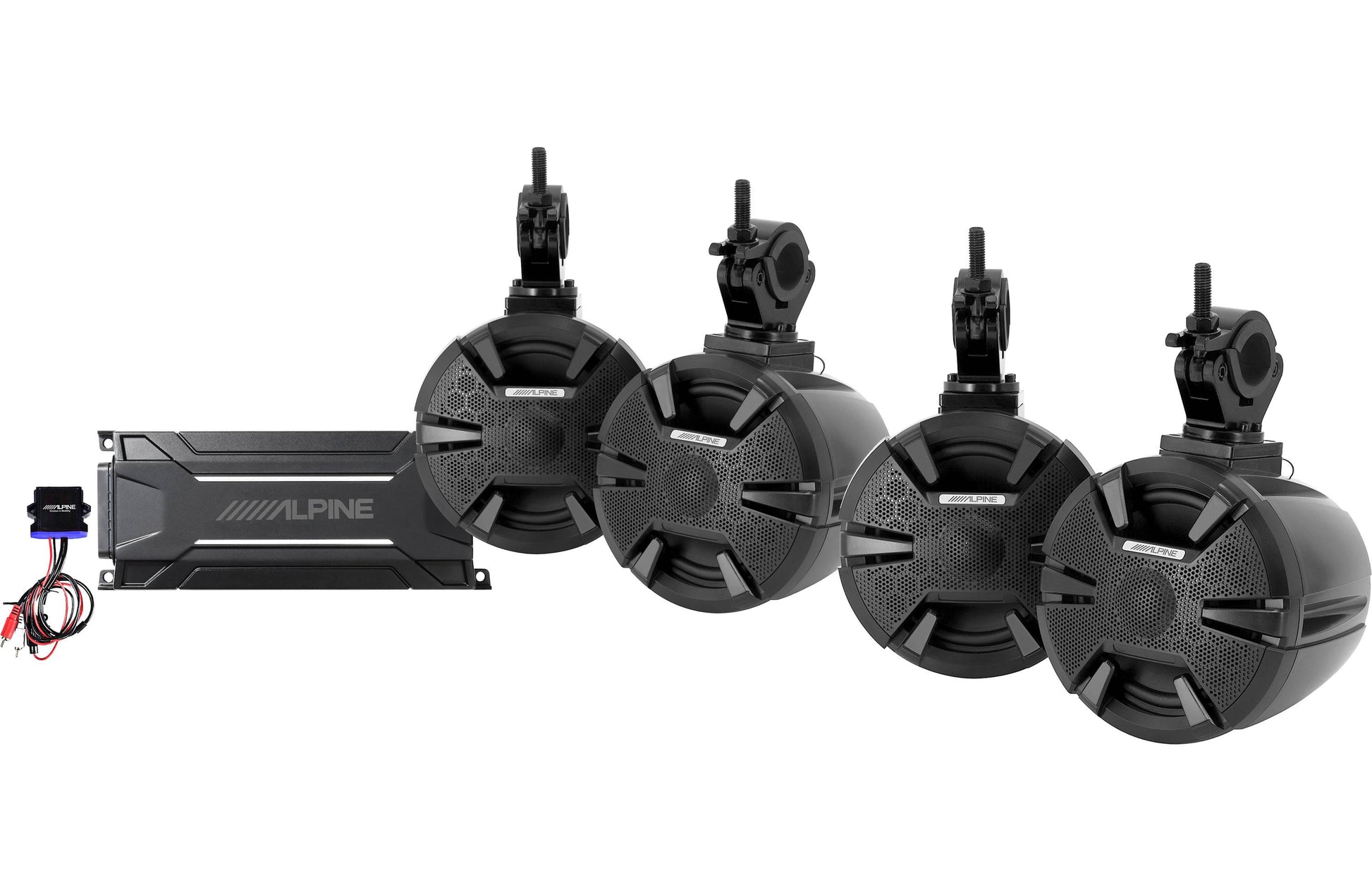 Overview: The Alpine PSS-SXS01 sound system has been designed as an easy add-on for your ATV, UTV, or side-by-side with 1.5"-2.0" diameter rails. It includes a KTA-30FW 4-channel amplifier, providing up to 75W RMS per channel, four SPV-65-SXS 6-1/2" speaker pods with built-in mounting clamps, and a KTX-BT200 Bluetooth audio adapter, all designed for all-weather powersports use.