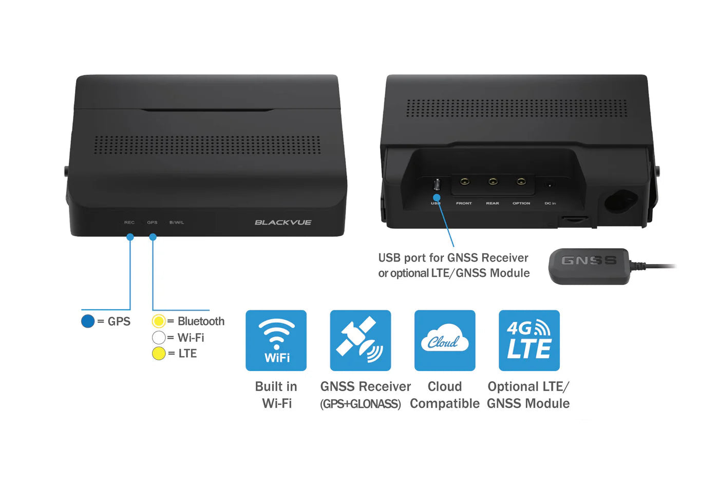 Optional LTE: For the optimal Cloud experience, you have the option to connect the DR770X to the BlackVue Cloud via an LTE connectivity module. The module can be connected via the USB port.
