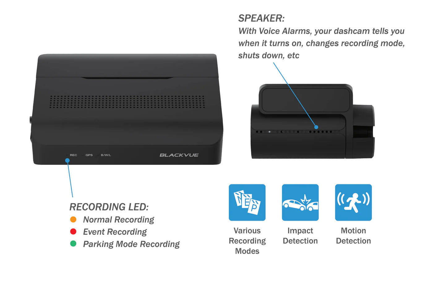 Normal recording, Event recording (when impact is detected in normal and parking mode), Manual recording and Parking recording (when motion is detected). * When using Hardwiring Power Cable, ACC+ will trigger parking mode. When using other methods, G-sensor will trigger parking mode. |