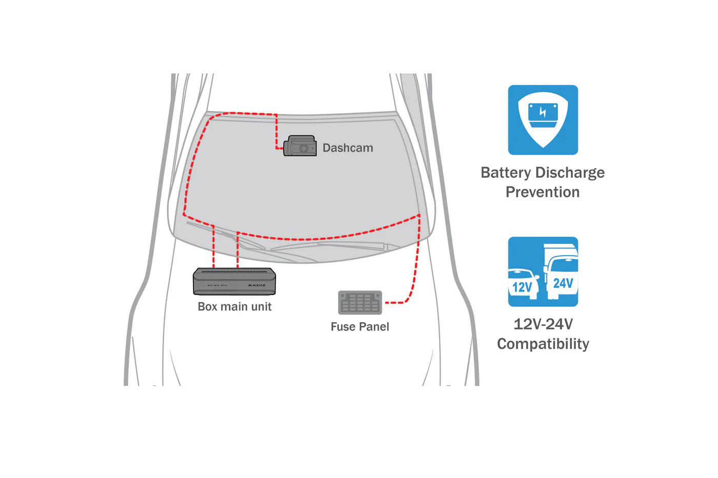 By using the included hardwiring kit or the optional B-130X battery pack, you can hardwire the DR770X to your vehicle's fuse panel for Parking Surveillance Mode. When the ignition is turned off, the DR770X will switch to Parking Mode automatically. There are three variations of Parking Mode available: