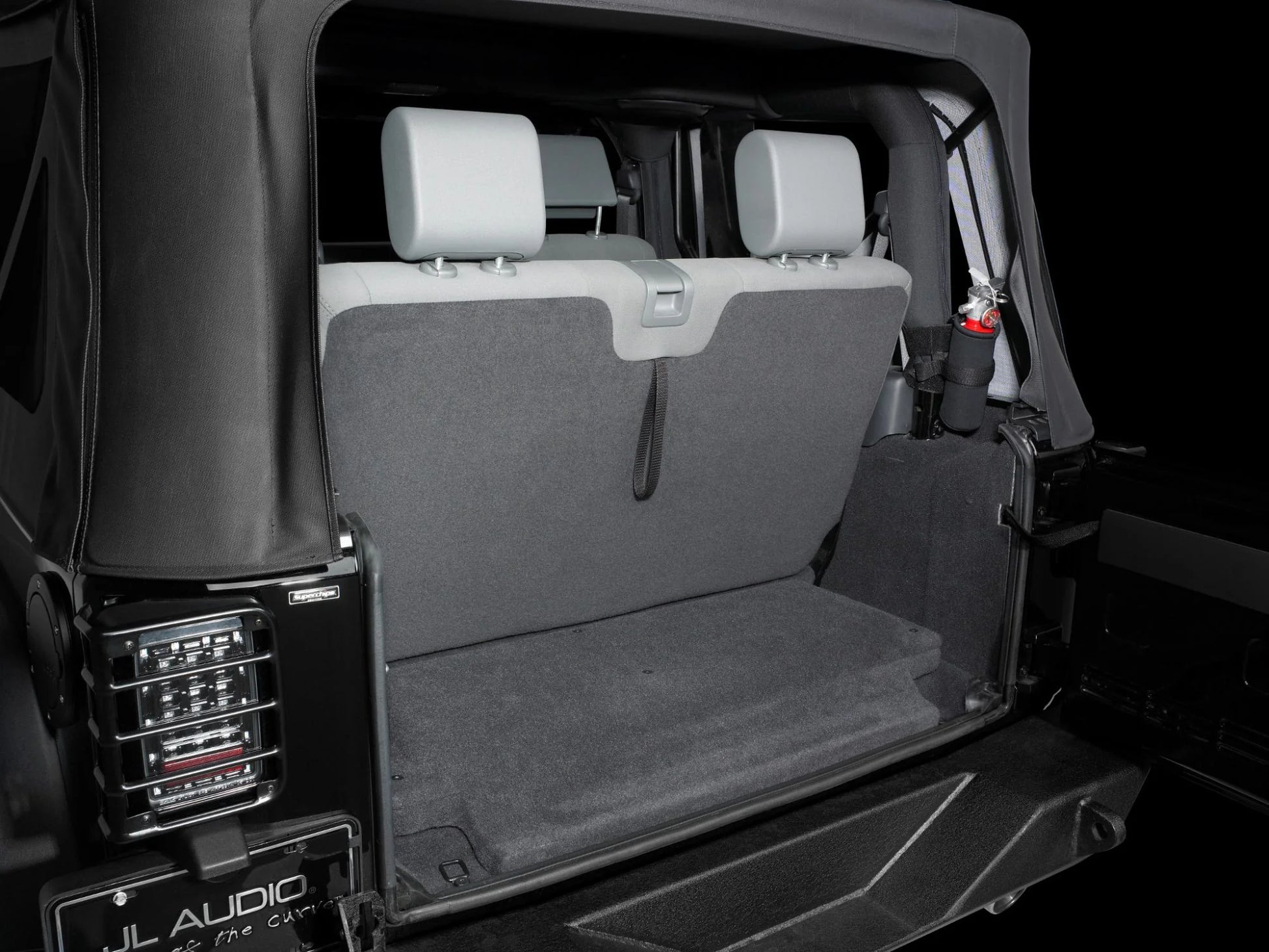 This low-profile Stealthbox® system sits inconspicuously on the cargo-area floor and features a rigid, carpet-covered, removable panel that conceals a powerful 10-inch Subwoofer and a secure mounting place for a JL Audio amplifier (sold separately). The Subwoofer is housed in a sealed, carpet-covered enclosure. The entire structure is designed to be easily installed and removed when the tailgate is opened, so you can choose to remove it if you plan to get your Jeep really filthy or need the extra space.