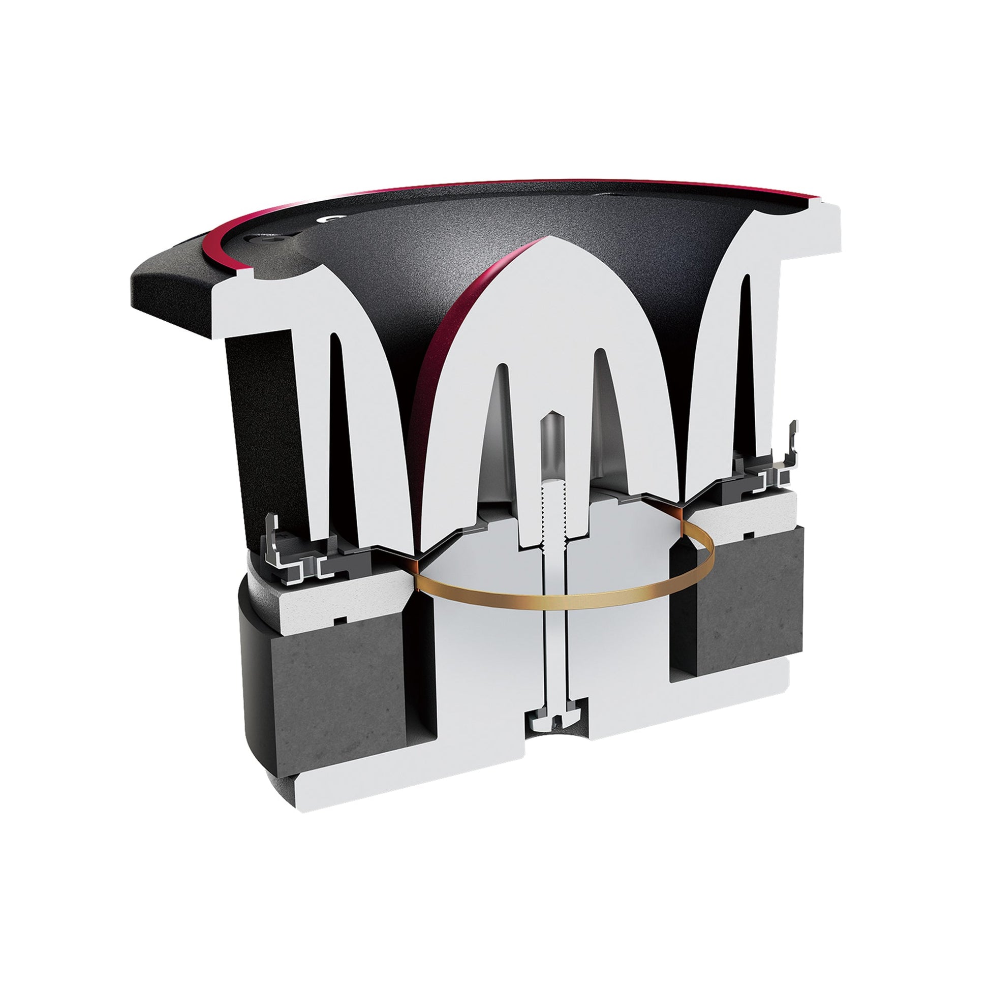 A titanium diaphragm is the centerpiece of the horn-loaded tweeter unit, which uses a high-quality die-cast aluminum basket and center bullet to maintain better accuracy under high power and improve heat dissipation.